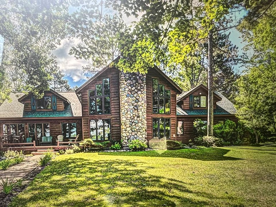 Spectacular Stormy Lake estate. The over 5 acre beautifully wooded parcel has a dead level approach to its 392 feet of the finest ripple sand swimming frontage in the entire Northwoods. You even get your own boat launch! The gin clear waters of 522-acre Stormy Lake provide amazing recreation. The massive floor to ceiling field-stone fireplace is stunning as is the totally renovated chef's kitchen. This home is specifically designed around entertaining and enjoyment. With two main-floor master suites and four upper bedrooms you will always have plenty of room for family and friends to enjoy the lake home. There is an attached heated, drive through, three car garage along with a detached four car garage. There are so many wonderful amenities that you really do need to visit to fully appreciate them all. One party listing- Sold at print
