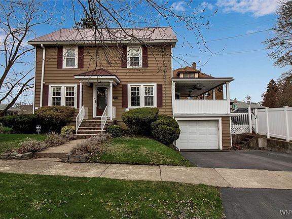 Incredible Deveaux location, close to the Niagara Gorge and Devil's Hole hiking trails. The first thing you will notice upon entering this home, are the gleaming hardwood floors throughout the home and the beautifully updated, open floor plan. Large living room with bay window, gas fireplace, plus built-in shelves for added character. Updated kitchen with granite counters and new appliances included. Formal dining room with built-in cabinetry. Sliding doors off the kitchen lead to a spacious, covered deck with bar and step down to a lower-level deck, leading to a fully fenced yard. Perfect for entertaining in the summer months. Newer vinyl fence -3 years old. Hardwood floors throughout all 3 bedrooms on the second floor, plus stairs leading to a third-floor attic for tons of storage or potential to finish off for additional space. Metal roof, brand new HWT 2025, furnace 7 yrs old and A/C 4 yrs old. Extra shower in the basement for added convenience. Security system, vinyl windows, and central air. And, you will absolutely LOVE the finished basement! It features a great built-in bar; perfect for entertaining friends on Game Day or just relaxing after a long day. The cozy gas stove adds warmth and a comfy vibe, making it a great space year-round. Nothing to do but move right in! Showings start immediately. This one won't last!