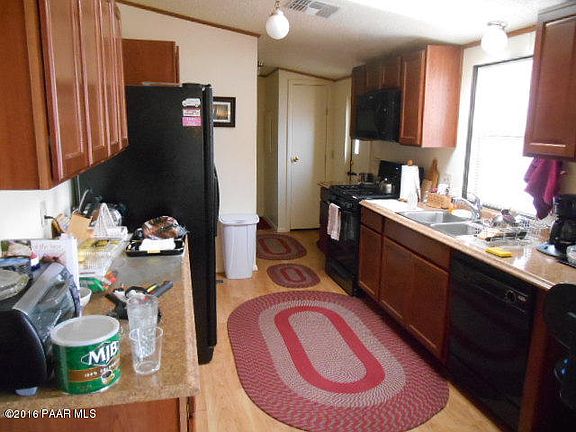 3 bedrooms, 2 baths, nice manufactured home in Prescott Valley. Galley kitchen has a skylight. Refrigerator, washer and dryer included. Living room with vaulted ceilings and beam. 1 car detached garage with opener. City water and sewer, no HOA.