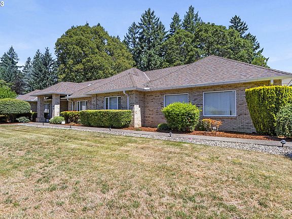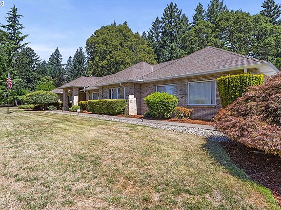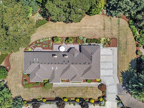 Sprawling One Level Ranch-Style home tucked away on a manicured, level, private and gated Jr. Acre Lot near the Beloved The Allison Inn in Newberg! Great home for the car enthusiast and lover with the oversized 4 car garage approximately 1200 SF. This Quality built home features 4 bedrooms and a den. You'll love the light and bright, open and spacious feeling with the high 9' ceilings, vaults and skylights throughout. The gracious entry way features a double front door covered entry with skylights. The formal Living Room is vaulted with a gas fireplace and hardwood floors. The formal Dining room has a glass-block wall allowing natural diffused light and fun style. The kitchen is very large and spacious and room for everyone to help prepare meals and perfect for entertaining and big gatherings. The island has a gas cooktop, walk-in pantry, hardwood floors, abundant cabinets and storage and room for all your kitchen appliances and gadgets! There is a sunny bay-window nook with door to the backyard patio. There is an adjoining family room with hardwood floors and gas fireplace. The primary bedroom is very spacious with skylights, jetted tub, door to the backyard patio, walk in closet, separate storage area through closet. The other bedrooms are spacious as well. The den has double doors. There is a spacious utility room and storage galore throughout the house. There is a newer roof, 2 furnaces, 2 AC units, 2 water heaters. The backyard is an outdoor sanctuary with the view of beautiful trees, yet a sunny yard allowing for great gardening of all kinds. There are raised garden beds, fruit trees, palm trees, grapes, sprinkler system, exterior lighting and a lit walking path. The elegant stamped concrete patio is the length of the house and features 5 wonderful park benches for your guests and room for entertaining year-round. There is even a flag pole with a solar light!