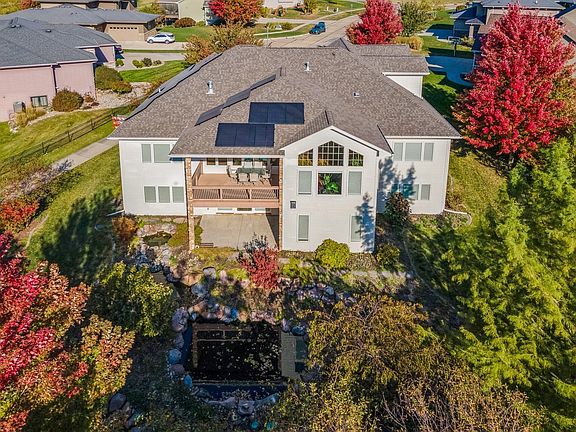 Backing up to the Clive Greenbelt and Recreational Trail, on a large cul-de-sac lot, is this 5+ BR, 5 bath, 4,619 SF walk-out ranch with two actual offices, including a 336 SF bonus room on the second floor. The main floor is an open plan with lots of windows and light, 10’ ceilings in the formal dining room and great room, which has a gas fireplace; 2 BRs, an office with plenty of built-in shelves; kitchen with a walk-in pantry and outside exhaust vent; half bath, laundry room, and primary bath with large tile shower with body sprays, hand wand and rain shower head. The walk-out basement has 9’ ceilings, 2 more bedrooms, 1 ¾ baths, large rec room with room for a pool table; family room with second fireplace; exercise room, walk-behind wet bar and a separate wine cellar. The second floor has a bonus room that can be a great work-from-home office or a hobby room. The home has 6” exterior walls, new $30,000 solar panels (2023), new three zoned furnace (2023), new central air (2021), in-floor hot water radiant heat in the basement and a whole house fan, which helps lower the gas and electric bill to a 24-month average of an astounding $93/month. Other updates include new exterior paint (2021) and new roof (2021). Extras include a covered Trex deck, central vac and landscaping pond. This home offers an unbeatable combination of function and beauty.