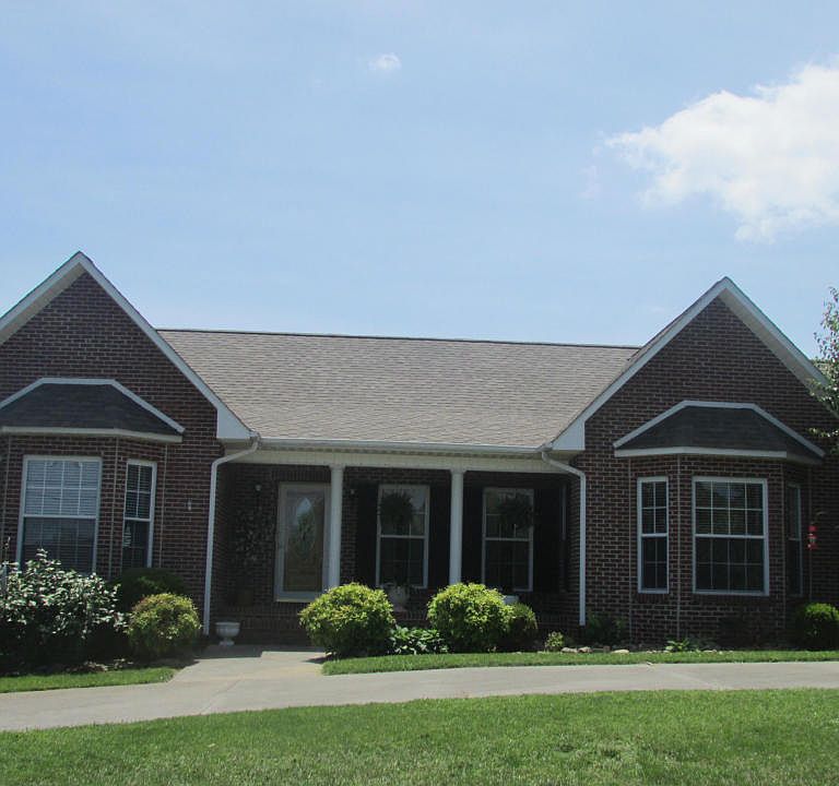 All BRICK one level home in move in condition! This home offers a split bedroom plan, Formal Dining Room, Family Room w/Brick Fireplace, Gorgeous Sunroom w/full wall of windows, Spacious Master Suite w/Double Vanities, Whirlpool Tub & Separate shower, Huge walk-in closet off Master Bath, Beautiful Eat-in Kitchen w/new hand scrapped hardwood flooring, built in desk/china cabinet, & cabinets galore! Gorgeous views & landscaping. New deck & Newer Roof. Side entry 2+ Car garage & Circular drive.