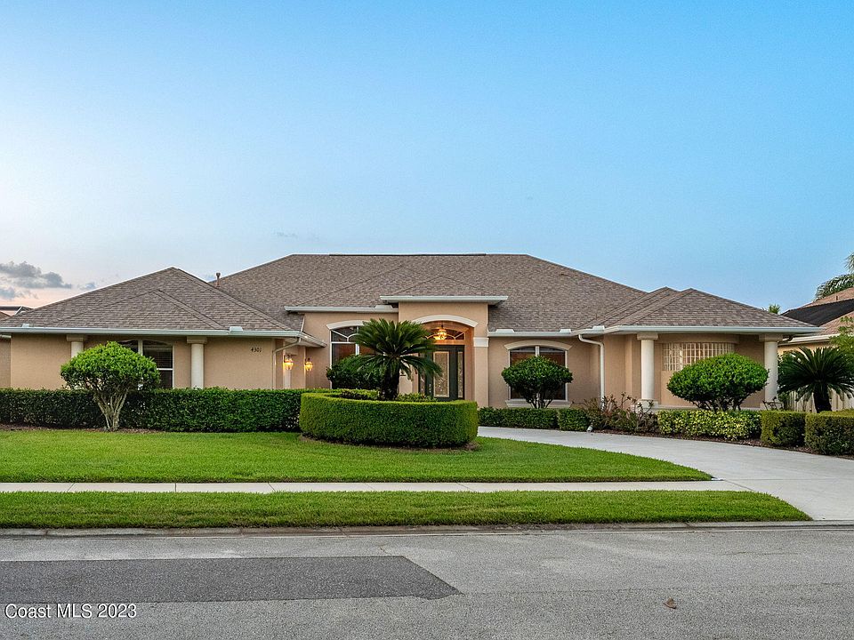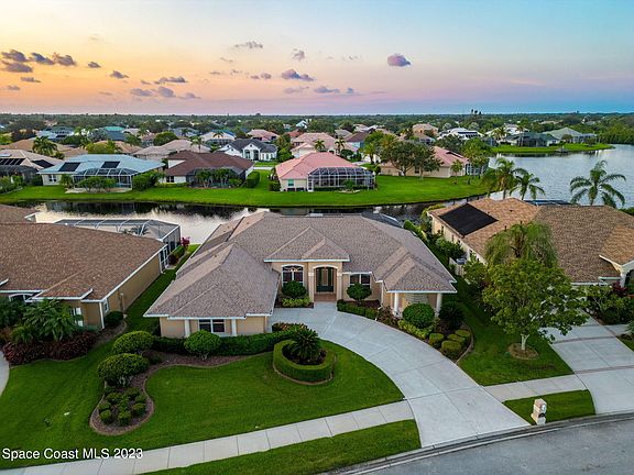Revel in spectacular lake views & lush landscaping! This 3bdrm+office/3bath/2+car, masterfully crafted estate greets you w/double glass doors opening to a large foyer flanked by a formal living & dining rm. High ceilings underscored by tile floors sweep you through all main areas. Gorgeous wood-look tile floors accent the master, family rm & office. The kitchen showcases tall wood cabinets, Corian counters, built-in oven, cooktop, work station & bfast bar. A welcoming family room is marked w/built-ins & a gas fireplace. The master has private pool access, his/her walk-ins, dual vanities & separate tub/shower. Celebrate the views, the waterfall pool & sizable deck! Hurricane accordion shutters & Armor screens protect this home, roof 2020 & AC 2018. Minutes to PAFB, the beach, I-95 & Costco