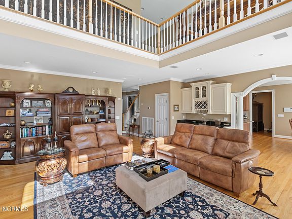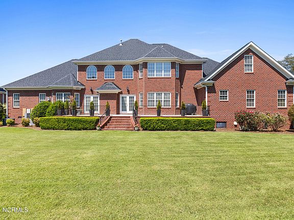 This stately brick executive home on a large corner lot directly across from the neighborhood pool and playground in desirable Georgetowne offers luxury and functionality for a family seeking space. With 5 bedrooms and 5 1/2 baths, the home is thoughtfully designed. The first-floor primary bedroom suite features a fireplace, sitting area, trey ceiling, his-and-her vanities and closets, a walk-in shower, whirlpool tub, and an adjacent room ideal for a gift wrap room, exercise room, or nursery. Another first-floor bedroom with a coffered ceiling and private bath is perfect for guests. Upstairs, three more bedrooms each have their own baths. Quality features include arched doorways, columns, crown molding, hardwood floors, and 9-foot ceilings. The great room, with a gas fireplace and wet bar, is perfect for entertaining, and a cozy office is conveniently located nearby. Two staircases lead to a double bonus room over the 3-car garage, ideal for a game room and study. Recent updates include a 2019 roof and newer HVAC units. Located across from the community pool, this home is in the Hoggard school district.
