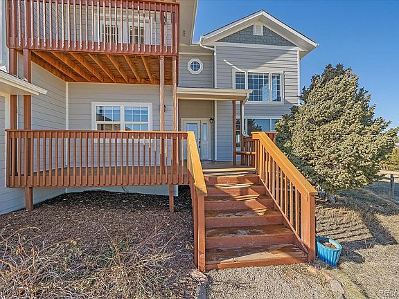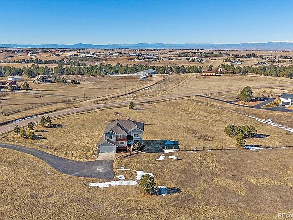 Welcome to Meadow Station, an exceptional custom home community in Parker, offering over 157 acres of HOA open space, riding trails, & paved roads perfect for country-life strong with horses or country-life lite basking in the tranquility. This thoughtfully designed home sits on 5.35 acres, providing breathtaking Rocky Mountain views & exceptional privacy. The home features a spacious two-story layout with vaulted ceilings in the living room & entryway, creating an inviting atmosphere. The delightful kitchen is perfect for entertaining or everyday enjoyment with extended cabinetry, new quartz countertops, a large undermount single-bowl stainless sink, stainless steel appliances—including a French door refrigerator, double oven/range, microwave, & dishwasher—along with a pantry & beverage fridge space. Wood-look tile flooring flows throughout the main level for durability & convenience. The vaulted family room is bright & open with large viewing windows & a cozy gas fireplace. The main floor also includes a versatile study, which could easily be used as an additional bedroom, a powder bath, & a large laundry room having potential for a mudroom & storage bins, bench, & hooks. Upstairs, the master suite offers a private west-facing balcony with stunning mountain views. The remodeled master 5-piece bath includes a freestanding tub, oversized tiled shower, dual vanities, & expansive walk-in closet features built-in gun safes & jewelry built-in. Two additional bedrooms, remodeled full bath & loft w/a covered east-facing balcony complete the upstairs. The expansive acreage offers ample room for horses, hobbies, outdoor activities, & backs & sides to HOA open space, enhancing the relaxation of peaceful country life. James Hardy siding & trim, new furnace, central air conditioning, interior paint, & new 1500 gallon septic tank to support 5-6 bedrooms. Full walk-out basement w/10-ft ceiling potential.Financing available-BOK Financial Tracey Christopher 303-524-3112nmls#248843