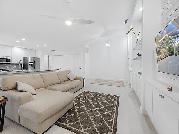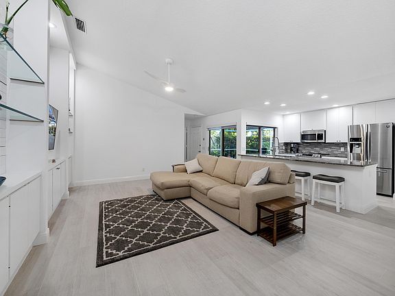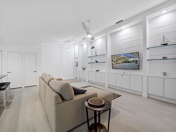 The first thing you'll notice when entering this remodeled 2 bedroom and 2 bath, single story, dual master, split plan villa/townhouse is the beachy vibe and soaring ceilings that add to the bright and airy feel. Renovations were just completed and include stainless Samsung appliances, gorgeous quartzite countertops, updated cabinetry, new water heater, wood tile flooring, shiplap feature wall with shelving and cabinets, and smart ceiling fans. Other renovations include replacement of water pipes, a refinished epoxy patio, popcorn ceilings removed and a re-screened patio enclosure. It is conveniently located away from the parking lot in the Heart of Palm Beach Gardens, with easy access to I-95, Gardens Mall, PGA Blvd., Wholefoods, Trader Joe's and the area's best beaches.