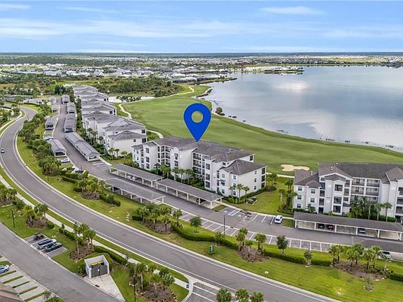 GOLF INCLUDED! Absolutely stunning SW sunset views with long lake view over the golf course from your 4th floor, screened lanai! Lovely, open floor plan with a spacious living/dining combination featuring plank laminate flooring and crown molding with that spectacular view! The kitchen has an island and loads of fresh white cabinetry and stainless appliances with gorgeous granite countertops for prepping and preparing. You and your guests will appreciate the split bedroom floorplan offering the maximum in privacy and the owners suite features 2 walk-in closets. Babcock National clubhouse will offer a more formal and grill dining options, meeting and social rooms for gatherings, pool/spa, tennis, pickleball, bocce, putting green and aqua range, this is just a great community! All part of the Babcock Ranch lifestyle, with schools, shopping, gathering spots, full fitness, medical facility and simply self-contained, you can enjoy extended enjoyment in your neighborhood or venture out to lovely Fort Myers, Punta Gorda, Charlotte Harbour area for even more shopping, dining, arts, entertainment and easy access to Punta Gorda and RSW airports!
