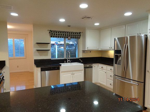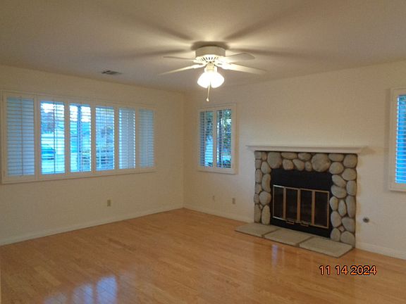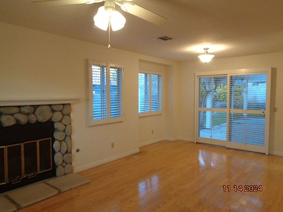 Upgraded one story home in excellent condition. This floorplan offers 1496 sq. ft. and was built in 1986. This home has brand new interior paint. New energy efficient shutters and ceiling fans throughout. Real wood floors. Open living room with rock fireplace, dining room and family room off of the kitchen. Remodeled kitchen with quartz counter tops, breakfast bar and farm sink. Appliances include dishwasher, gas range, microwave, refrigerator (no warranties). Large master bedroom, master bathroom has a walk-in shower. Laundry hook-ups in the garage with washer and dryer (no warranties). Picturesque landscaping covered patio and above ground spa make this a truly enjoyable backyard. NO PETS. The owner requires a minimum FICO score of 675. The owner pays for trash and gardener. 1 year lease required.