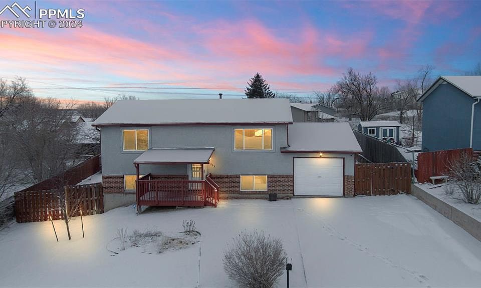 Welcome to this great home in the heart of Stratmoor South! This bi-level residence boast new exterior stucco, repainted covered front porch, and views of Cheyenne Mountain, offering a picturesque backdrop to your daily life. Upstairs you'll find the primary bedroom, a second bedroom, and a full bath along with the kitchen and living rooms. Descend the stairs to the lower level, where a cozy family room awaits, along with two more bedrooms. The property comes fully equipped with all major appliances, including a second refrigerator in the garage – making your move-in seamless and stress-free. Step outside into the low-maintenance yards, enclosed by a cedar picket fence, offering both privacy and charm. The backyard features a dog kennel and a storage shed, providing additional functionality to this already great home. Situated less than 5 minutes from Fort Carson's gate, this residence offers unparalleled convenience for military personnel. With easy access to I-25, the adventures of Colorado Springs are just a short drive away, making every day a new opportunity for exploration. Don't miss the chance to make this great house your home – schedule a showing today and start envisioning a life of comfort, style, and scenic beauty in Stratmoor South!