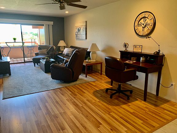 Second floor unit in building 9, looking directly at our beautiful sunsets. This view will never change of the golf course and surrounding mountains. King sized bed, fully stocked kitchen, full sized washer/dryer as well. Pet friendly, 35 lbs.