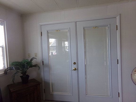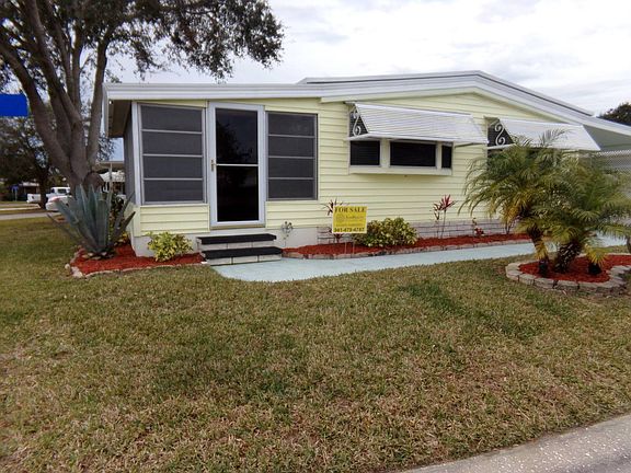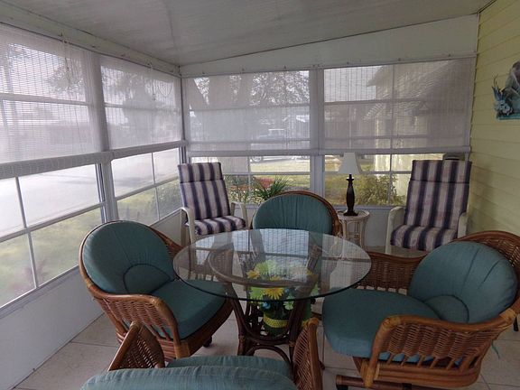 This is an updated "turn key" double wide located on a corner lot. New sub flooring with ceramic tile and carpeting is throughout the home. The galley kitchen has new ceramic tile flooring, new counter tops, plenty of cabinets and an island with stools. All new doors and new lighting is throughout the home. A formal dining area flows into the living area featuring bay windows across the front of the home. Off the living area is a pair of french doors with built-in blinds which leads into an enclosed sun room that has a view of the neighborhood. Both bedrooms have new beds and full wall closets. The master has it's own en-suite. New shower inserts, new toilets and new ceramic tile flooring are features in both bathrooms. The home has a 2011 central A/C unit which is serviced regularly, as well as a new vapor barrier. At the back of the carport is a storage shed that houses a new washer/dryer, a work bench, a power washer and various tools which are included in the sale. This move-in ready, updated home has tasteful furniture, as well as all furnishing and decor included in the sale. At the back of the home is a patio for grilling or for parking your golf cart.