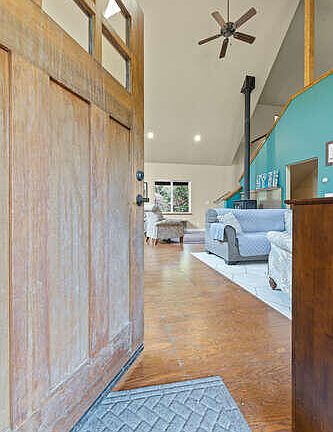 There is a great flow to the home with the kitchen open to the living and dinning areas that feature wonderful rustic hardwood flooring, woodstove and large windows that bring in beautiful natural light.