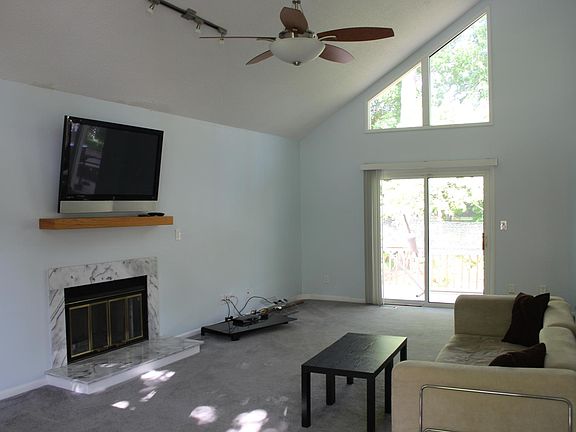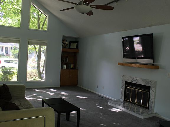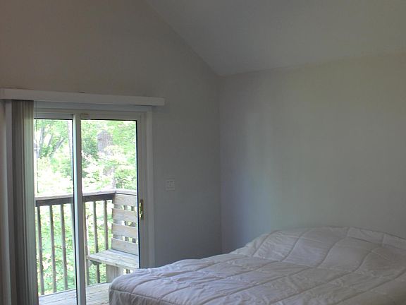 Beautiful contemporary home with soaring windows and lots of natural light. Huge family room with 2 story vaulted ceilings. Large deck with hot tub. 1st floor bedroom with attached bathroom. Large master bedroom with large walk in closet, balcony, vaulted ceilings in both bedroom and bathroom, master bathroom with tiled shower and sky light. Built in book cases and cabinet. Neighborhood has a pool one block away with use included in rent. Easy access to 440 and 540.