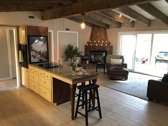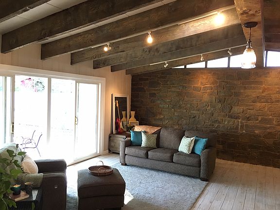 This house is AMAZING!! Be prepared to be WOWED! Stunning open living room, dining room, and kitchen graced with tasteful cedar wood beams, stone wall, matching stone fireplace and an abundance of natural light from double-wide glass doors and skylights above. See this unique jewel of a house for yourself and all of its touches. Handy? An inset work bench area in the garage awaits. Call it home!!! FYI...water heater and furnace are in the closet behind the television.