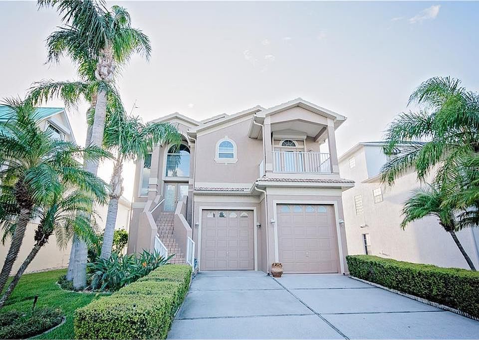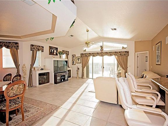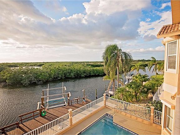 Remarkable sunsets await at this cul-de-sac home This spacious three bedroom, three bath home offers over 2,700 sq ft of living areas perfect for large families. This unique floorplan offers a main great room/kitchen/dining room combo with sliders out to a large, covered balcony to take in the water and conservation area views. Enjoy picturesque, wild Florida. The master bedroom with en suite bath and bay window sits on this floor along with another bedroom with en suite bathroom and private balcony. A floor down sits another large great room with second kitchen, screened balcony and bedroom with en suite bath. This would make the perfect mother-in-law suite or guest suite. Your private oasis awaits outside with a saltwater, in-gound pool with gas heated spa and large dock with water, electricity and 12,000 lb lift. The over-sized three car garage features 10ft high doors and 14ft high ceilings, commercial grade door opener to accommodate RVs and large boats. This home offers indoor laundry room and separately air conditioned storage room currently used for wine storage. This home is elevated and offers hurricane shutters and low flood insurance. This is waterfront living done smart.