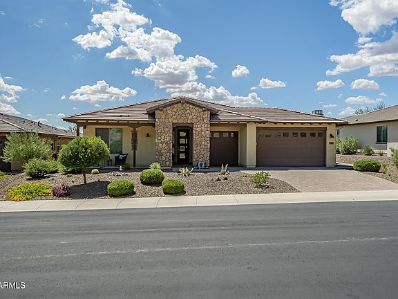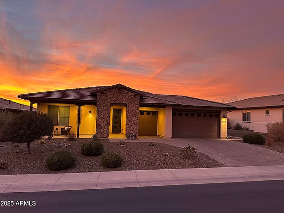 Key features of this home are the hard to find THREE CAR garage perfect for an extra car, golf cart or workshop; PAID Solar so no worries about the increasing costs of electricity. This nearly new home featuring an oversized lot offering backyard and front yard privacy and breathtaking sunsets! Enjoy the serenity of the open desert from your patio, perfect for relaxing and entertaining, with firepit views of the amazing Vulture Peak and a BBQ station for grilling. Two bedrooms, two bathrooms AND a Den that can easily be used as an extra bedroom or office. You will be captivated by the popular open floor plan, featuring a kitchen with multiple upgrades including elegant quartz countertops, a beautiful backsplash, and a convenient beverage fridge. Check out all the upgrades this beautiful home has included with the photos. The large kitchen island/breakfast bar seamlessly connect to the great room, which boasts a 24-foot sliding door and a generous dining area. There are remote shades granting shade for the entire patio offering yet another room to enjoy. This home offers elegant plank ceramic tile accompanied by new luxury vinyl plank flooring in both bedrooms. No carpet! The split bedroom layout provides privacy with a huge master bath within the primary suite, complete with a large walk-in closet. The home has been meticulously maintained, reflecting pride of ownership and is in the highly sought-after Wickenburg Ranch community where you'll have access to walking trails, pickleball courts, year-round heated pool and spa, two golf courses and dining options for either an elegant dinner or a quick breakfast prior to a round of golf. Don't miss your chance to own this incredible property!