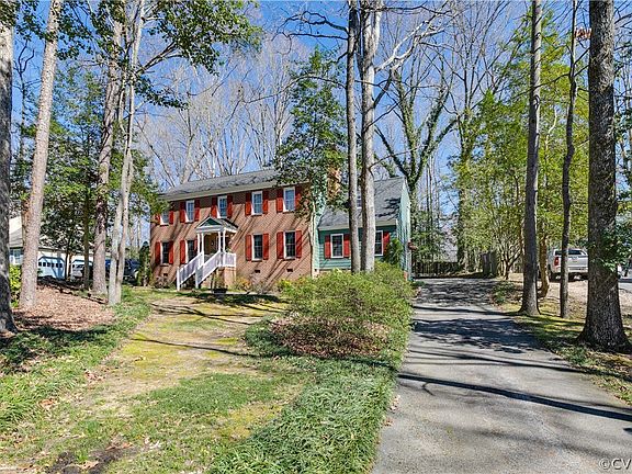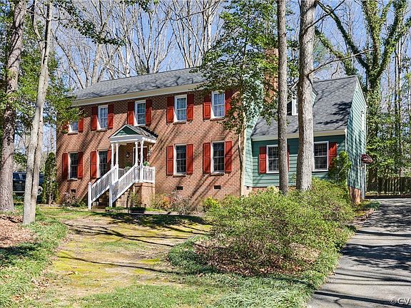 Welcome home to this charming two-story home located along a peaceful cul-de-sac street featuring a newer roof (2019)! Pull into the long driveway shaded by mature trees where you’ll be greeted by a warm green and brick exterior. Step inside to a foyer with wainscoted walls, crown molding, and hardwood flooring that continues throughout most of the home. To the left of the foyer is a spacious formal living room then continue into a bright and welcoming formal dining room with gorgeous floral wallpaper and gold chandelier. The eat-in kitchen features stainless appliances and white cabinetry. Through the French doors is a light and bright sun room with sliding glass doors to lead out to the expansive back deck. Continue into the family room that features a cozy brick fireplace and wood beams along the ceiling. Additionally on the first floor is a laundry room and powder bath with updated vanity. Upstairs you’ll find a large primary bedroom with walk-in closet and full en suite bathroom. Also upstairs are three additional bedrooms, a full bathroom, and access to a large walkup attic. In the backyard you’ll find that the trees and large lot size provide great privacy. Don’t miss out on this beautiful Chesterfield home, book your showing today!