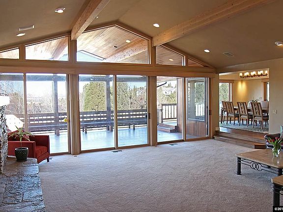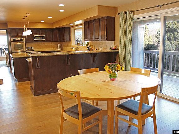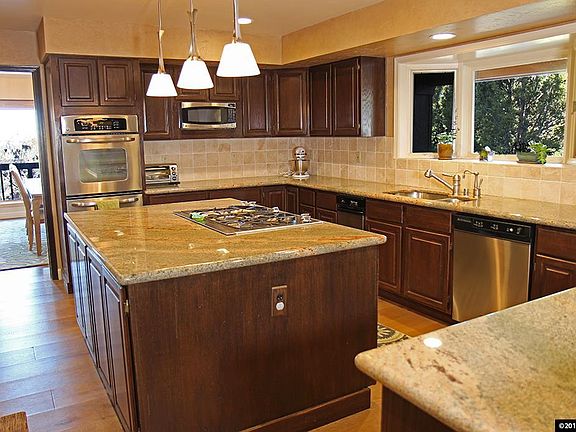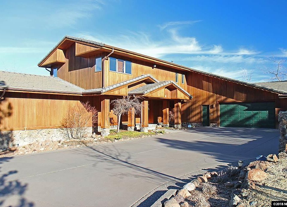 This custom Caughlin Ranch home has 6 bedroom and 4.5 bathrooms with beautiful mountain and valley views. Wood, carpet, and ceramic tile floors have been updated along with the kitchen. Updated kitchen offers an island, breakfast bar, and pantry. Master suite has a walk-in closet, fireplace, high ceilings, a jetted tub with separate shower, and is on the main floor. The covered upper level deck opens to the living and dining rooms. Home also has an office/den, finished basement and formal dining room.