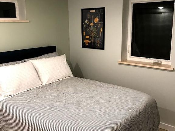 This super cute private apartment is the basement of a house style duplex. It has a full kitchen and a cozy living room with a nice table to eat and work at. There is a glass framed shower and a comfortable bed with a large window looking out into the garden. Tenant pays electric bill ( in the name of the landlord, bill will be presented at the end of each month, Tenant pays flat fee for water Three month lease. Landlord pays garbage and internet