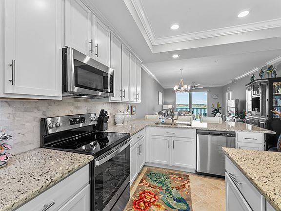 Welcome home to the 3rd floor Unit with GOLF MEMBERSHIP in Babcock Ranch! This condo IS TURNKEY. It is located in Babcock National, a gated golf and country club community within Babcock Ranch. The stunning home features 2 large bedrooms and 2 full bathrooms with crown molding, ceiling fans, lots of natural lighting, and diagonal tile flooring in the main living spaces, and an outdoor 5x7 ft. detached concrete storage unit. The kitchen is equipped with granite countertops, ample cabinet storage, a large breakfast island, and stainless-steel appliances. The living/dining space overlooks a covered/screened lanai with a view of the Lake Babcock & golf course beyond. Amenities include a championship 18-hole golf course, a resort-style pool with lap lanes and a spa, a state-of-the-art fitness center, a tennis center, pickleball, bocce ball, a community clubhouse with dining options, and much more