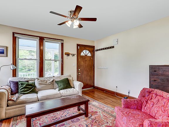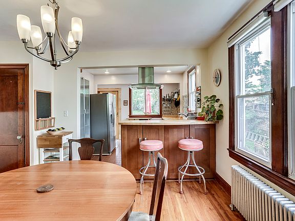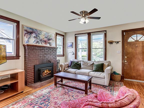 This quintessential Mount Rainier bungalow with its iconic covered porch and broad columns feels like home at first sight. Natural light pours into the home through double paned windows, illuminating the original wood trim and solid hardwood floors throughout. This energy efficient home draws power from owned rooftop solar panels reducing utility bills and one's carbon footprint. Depending on usage, the electricity from the solar panels can reduce your electric bill by 50-100%.The main level has an open concept living room, dining room and kitchen. The wood burning fireplace is the focal point of the living room, useful not only in appearance but also providing heat with its insert. In the kitchen, delight over the wealth of counter space available while enjoying outdoor views. Storage space abounds in the functional U shaped kitchen featuring stainless steel appliances, butcher block countertops, and gas range with vent hood which makes cooking a breeze regardless of what is on the menu. On the south side of the home are two spacious bedrooms, each with corner views of their respective sides of the house, and a hall bathroom with pedestal sink and tub. Upstairs, with full height ceilings, features a master suite, 2nd bedroom, full bath and walk in closet. The master suite with front facing dormer, comfortably fits a king size bed, the L shaped space offering a range of options including the possibility of an additional closet, sitting room or den. The second bedroom is also sized well for a bed and offers extra under-eave storage. The full bathroom on this level has been recently renovated with new tile and fixtures. Storage is not lacking on the upper floor with multiple closets, built-ins, and a separate walk-in closet with bonus space. The lower level is a fully finished basement with a separate entrance, perfect for guests whether short or long term. With a shared laundry and storage space accessible from upstairs and down, the lower level suite functions as independent living space with full kitchenette and bath. Choose where to unwind outside on the oversized covered front porch, or enjoy the level shaded backyard with deck. The grassy backyard offers ample room for outdoor enjoyment with its carefully curated family of mature trees for just the right mix of sun and shade.