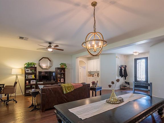 Gated-Living in Southern Oaks located in a cul-de-sac. Open concept living features high ceilings, handsome arched doorways, built-ins, recessed & designer lighting, formal living/dining, great room w/sunny breakfast nook and stunning finished materials throughout. A spacious kitchen is appointed with sleek, cool Quartz counters, full subway-tiled backsplash, generous white painted cabinetry, double ovens, gas cooktop, pantry, and a large central island complete with breakfast bar, and a farm sink. A built-in desk and extended counter is ideal for a coffee bar and hobby space. The master retreat and ensuite include a beautiful subway tiled garden tub w/shower stall, dual vanities, private water-closet & walk-in wardrobe. You'll also find a separate wing with 1 bedroom, bathroom & laundry room w/upper and lower cabinets, sink and counter space. Exterior features include a 3 Car Garage, beautifully manicured front & rear landscape- block walls and logia for entertaining.