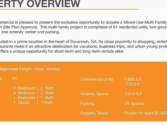 The multi-family project has site plan approval and is comprised of 61 residential units, two ground floor commercial units, one amenity center and parking.