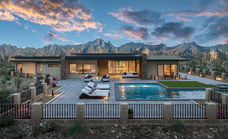 Exceptional brand new desert contemporary custom home located on a pristine 3-acre saguaro-studded lot in exclusive guard gated Cat #10. This elevated cul-de-sac lot delivers extraordinary views & privacy coupled w/ thoughtful design & flawless execution for the ultimate in desert living. Long driveway lined in pavers leads to inviting courtyard entry & dramatic glass pivot front door. Modern chef's kitchen w/ sleek cabinetry, waterfall island, Wolf & Sub-Zero SS appliances opens to spacious great room w/ FP & formal dining. Massive retractable glass door leads to deep covered patio & resort-style backyard w/ pool, spa & unobstructed views of the city lights. Effortless indoor/outdoor living for gatherings small & large. Expertly designed split bedroom floor plan CLICK MORE to continue.. has owner's wing complete w/ impressive master suite w/ FP & captivating views, truly luxurious spa-inspired master bath w/ modern soaking tub and separate shower, expansive his & hers closets w/ dedicated washer and dryer and separate office and exercise room. Powder room at entry for guests/entertaining. Guest wing is comprised of 3 generous sized en-suite guest rooms each w/ walk-in closets that are centered around a multi-purpose retreat area that could be used as a separate tv room, reading room or space for doing homework. Additional game room and fully-fitted wet bar with fisher paykel dishwasher and sub-zero beverage refrigerator and wine cooler. 4-car garage with large storage room has garage doors with vertical side window design. For those looking for privacy and serenity and very close proximity to the best shopping, restaurants, world-class golf resorts, the University of Arizona and downtown Tucson this location is unrivaled. Home is available for purchase now completion of home is scheduled for early 2021
