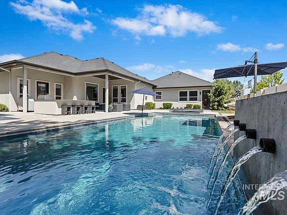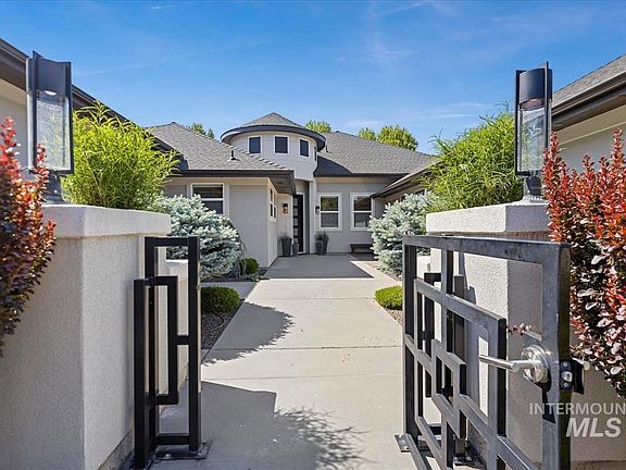 Welcome to your stunning single-level custom home on over half an acre—ideal for entertaining or peaceful living. Enter through a gated courtyard and into a beautifully designed space with every detail thoughtfully chosen by the original owners. Features include a Master Retreat, 2 En-Suites, 2 additional bedrooms, Office, and Bonus/Game Room. The Gourmet Kitchen boasts quartz counters, knotty alder cabinets, gas range, double ovens, walk-in pantry, and full-size fridge/freezer. Enjoy your fireplace, movie nights, or billiards in the Bonus Room. Step outside to a pool, hot tub, outdoor kitchen with gas BBQ, firepit, garden boxes, and professional-grade Bocce court. Upgrades include hardwood, tile, new carpet, custom lighting, and tile-surround baths. A 4+ car garage offers abundant storage. Located on a quiet cul-de-sac with easy access to Boise, McCall, the airport, freeway, and top-rated schools. Welcome to your new paradise!