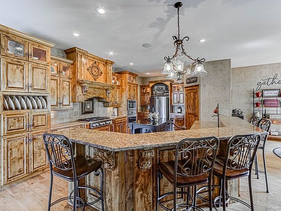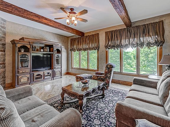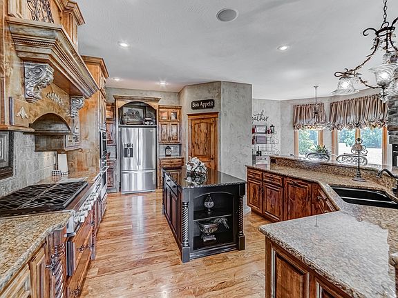 Welcome to this majestic 8,000+ sq ft maintenance free brick, stone and decking with outdoor lighting, cupola and finials. Custom eight-foot wooden door welcomes you into two story entry with beautiful hickory flooring throughout main level with 10-foot ceilings. The Formal dining room with faux stone columns leads you into living room with large stone fireplace and built ins that overlook the pool outside. Large kitchen has faux wood beams, hearth room and eating area with a see thru stone fireplace. Knotty alder cabinets are all soft close including bread drawer, warming drawer, and hidden trash container. All appliances are stainless steel GE Monogram with microwave/convection oven, two large islands, and walk-in pantry. Maintenance free covered deck off kitchen. Large laundry room with sink, huge closet, hidden laundry bins and coat and book drop-off. Front office has full wall of cabinets and vaulted beam ceiling next to Master in-suite. Master bedroom has lit up double tray ceiling with sitting area. Large double sink bathroom with jetted tub and large shower and double closet. Half bath off hallway. This home has double staircases for front and back. Second floor includes three huge bedrooms with walk- in closets. Two bedrooms share jack and jill bath with vaulted ceilings. Third bedroom has attached bath, window seat and built ins. There is a walk-in attic storage and hall attic fan. All bathrooms include their own linen closets. The Walk out basement leads to the patio with 40,000 gallon in-ground salt water ''L'' shaped diving pool with slide and diving board. Full bath with double sinks right inside patio doors. Large living area with surround sound attached billiards room with stone fireplace. Full bar with microwave, sink, and refrigerator. Two additional bedrooms with walk-in closets. Two large storage areas. Mechanical room and John Deere room that holds all pool system equipment. This home is a one owner builder built home in 2007.