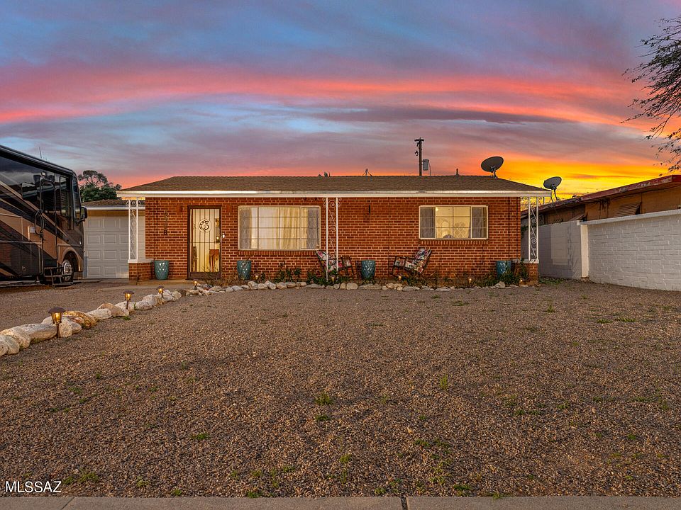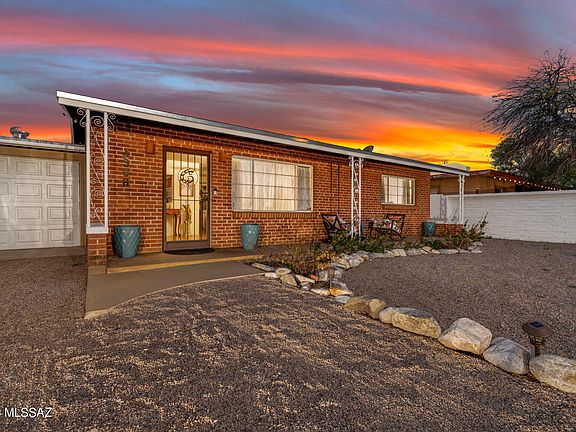Welcome to your charming 2 bedroom 1 bathroom home, located in Poet's Square! This delightful abode sits on a spacious lot surrounded by mature trees, offering both privacy and tranquility in a prime location. As you step inside, you'll be greeted by an inviting living room with a flowing floor plan. The kitchen features lovely wood cabinets and ample storage. The adjacent dining area provides the perfect spot for enjoying your culinary creations or hosting intimate gatherings with friends and family. The two cozy bedrooms are situated on opposite sides of the home, ensuring maximum privacy and peaceful rest.Outside, you'll find a large backyard, complete with a covered patio, perfect for savoring your morning coffee or enjoying an al fresco dinner. This home's prime location can't be beaten - you'll be just minutes away from the University of Arizona, downtown Tucson, and a plethora of shopping and dining options. The home has space for an RV and includes RV hookups. Your next chapter starts here!