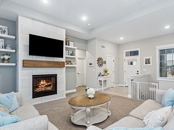 A beautiful home awaits a new owner! An eye catching front door with glass windows, high ceiling & tile floors greet you at the entry. A wonderful open living room is anchored by a gas fireplace, wood detailed ceiling, built-ins and beautiful views of the backyard. Adjoining the living room is a huge kitchen with quartz center island, white cabinetry, tile backsplash, gas range with range hood, amazing walk-in pantry with appliance shelf, dining space & wood flooring. The amazing master suite is the perfect place for relaxation and pampering and boasts a custom beamed ceiling & barn door to the bathroom. The tile bath features a large walk-in closet with seasonal hanging space, his/her sinks, standalone tub & a walk-in tile shower. Completing the main level are 2 additional bedrooms, a full hall bath & a great drop-zone area off the kitchen. The wonderful amenities continue in the finished view out basement. This is the place for entertaining with a large rec room & a wet bar. Also located in the lower level are 2 bedrooms, a full bath, unfinished exercise room & plenty of storage. Topping off this home is an awesome backyard that features a sprinkler system, irrigation well & a shady tree. Enjoy summer evenings from the covered composite deck or the patio with string lights!
