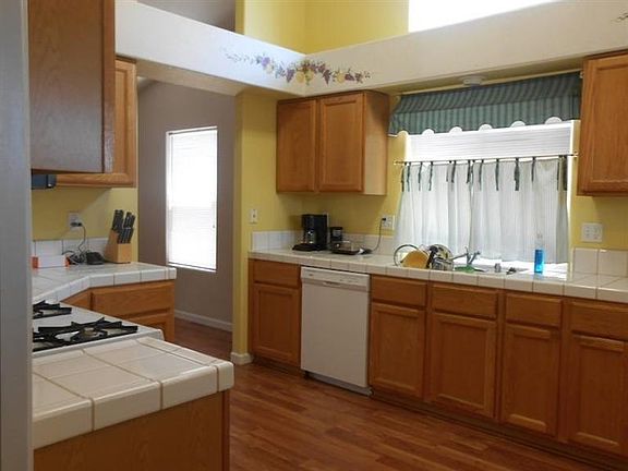 Sweet house just steps from the school, and down the street from restaurants and shops! Tile entry, pretty wood laminate flooring in living room, dining area, and kitchen. Nice master bedroom with 2 sinks, and a big walk in closet. Inside laundry, and a nice back yard.
