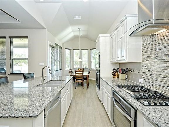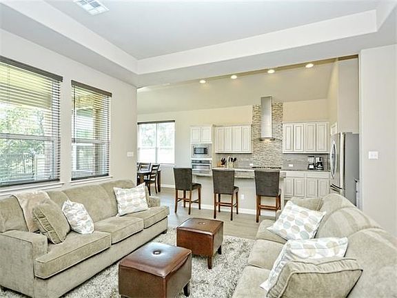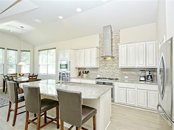 Highly upgraded home backing to greenbelt offers coveted 1.5 story floor plan just a short walk from community pool. 4 bedrooms and 3 full bathrooms downstairs and a flexible, spacious second living/game room with 4th full bathroom upstairs. 2.5 car garage. Spacious kitchen features 36 inch cooktop, granite counters, tile backsplash, dual ovens and whirlpool gold series stainless steel appliances. Ceramic wood plank tile in common areas. 2 inch cordless wood blinds throughout. Round Rock ISD.
