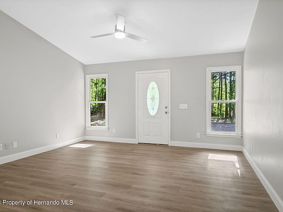 This well appointed home features 3 bedrooms, 2 bathrooms with a 2 car garage, nested on one of the most private cul-de-sacs in the area on a 43,560 square-foot / (1 acre) lot. This home sits back from the road for added privacy. The interior of this home boasts windows galore, warmth, natural light-filled oasis providing all conveniences, luxuries, and comfort. All three bedrooms contain a remote operated fan for your leisure. An extraordinary, full home renovation was recently completed with exquisite detail. Every room in this home has been meticulously renovated. When you enter the front door your eyes are drawn to the open floor-plan and floor-to-ceiling unobstructed views of the beautiful Brooksville Nature, which displays peace and tranquility. As you walk into this gem, you will notice the trendy LVT vinyl flooring, a large living room/ sitting area. To the right, you will enter the owners suite. As you enter, you will see a large room with many windows which allows for natural sun-light glistening between the many trees. The owners suite features two large walk in closets and a freshly renovated bathroom. Upon entering the bathroom you will see a white farmhouse sink with LED lighting and a beautifully crafted tiled walk-in shower. As you exit the owners suite and walk through the living room/ sitting area you will observe the spacious kitchen with large constructed island with plenty of room for entertainment.