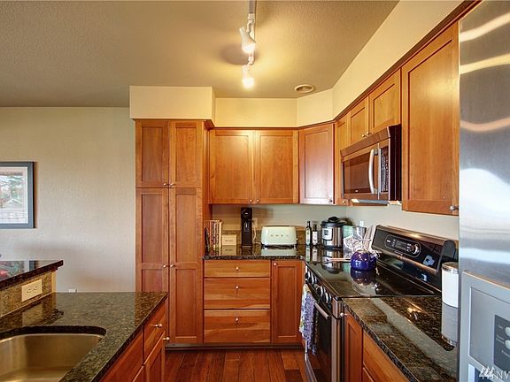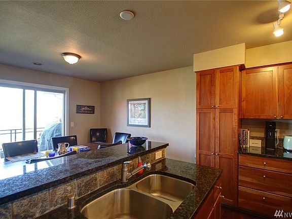 This upper floor Condo features many upgrades! Fabulous views of Fidalgo Bay and Mount Baker! The kitchen includes stainless Bosch appliances, cherry wood cabinetry, hardwood floors and granite counter tops. Nice large master en suite with a walk-in travertine shower. Kitchen and dining area opens to a wonderful deck to embrace that wonderful view of the bay and mountains! Enjoy the quietness, it is set in a park like setting! Covered parking space and storage unit.