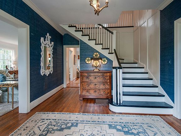 Timeless Colonial home in desirable location w/ many amenities. Classic architectural features & designer finishes throughout. .75 acre lot w/ mature trees, lush landscaping, & beautiful surrounding homes creates an idyllic setting for children & outdoor entertaining. Historic integrity maintained starting w/ grand columns, classic foyer & staircase. Spacious living room w/ fireplace. Custom kitchen w/marble counters, SS appliances, pantry. ML glass French doors to screened porch w/vaulted ceiling; adjacent balcony & deck. Primary BR w/2 closets & fully updated full bath, double vanities & walk-in shower. Fully finished basement w/ ample amenities: mudroom, laundry, & 3 large rooms; 1 a gym/office, 1 for storage, & 1 perfect for a playroom complete w/ wet bar & French doors to outside.