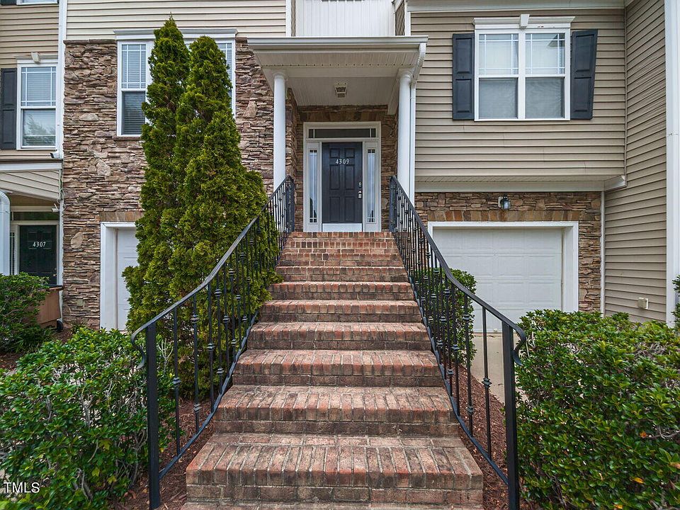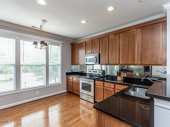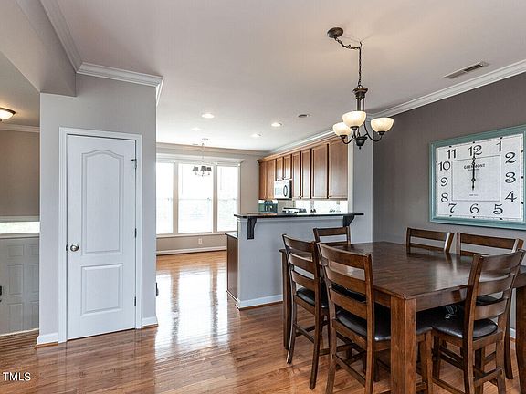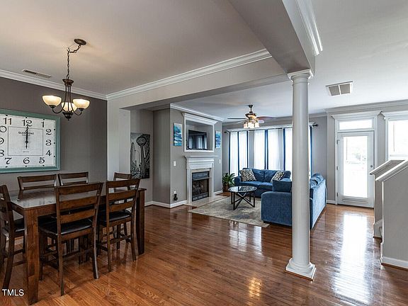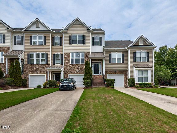 Beautiful three-story townhome with an oversized, one-car garage in the desirable community of Shearon Farms, Wake Forest. The main living area offers an open floor plan, hardwood floors, crown molding, a nicely appointed kitchen with a pantry, breakfast bar, dining area open to the living space with a gas fireplace, and a relaxing deck. The third floor features two bedrooms, each with private ensuite bathrooms and walk-in closets. In addition, the primary bedroom features a tray ceiling and a garden tub. The first floor offers a spacious third bedroom or bonus room with a full bath, a large walk-in closet, and access to fenced outdoor space. The community features a beautiful pool and lush landscaping.