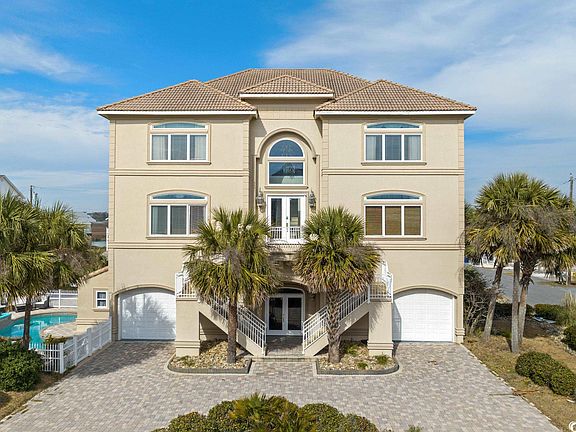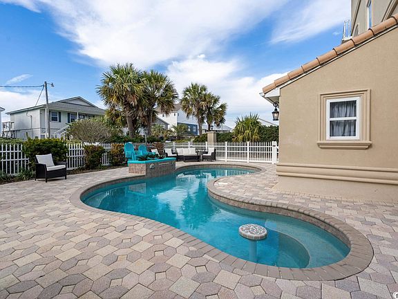 Discover luxurious coastal living in this custom-built beach home in the heart of Cherry Grove on this double sized lot, walking distance to the beach! Short term rental money maker or great as a primary residence or vacation home! Embrace the charm of Mediterranean architecture as you step into a fully furnished oasis (all furniture conveys). An elevator effortlessly glides through all three levels, ensuring convenience and accessibility throughout the home. The primary suite is a haven of indulgence, featuring large walk-in closets with built-in shelving, a dual vanity, a luxurious tub, a spacious walk-in shower, and even a private sauna in the primary bathroom. Step onto your own private balcony and savor breathtaking views of the channel and waterway views. Each bedroom upstairs offers a private bathroom and closet, catering to both comfort and privacy. This thoughtfully designed home includes a dedicated study/office space for work or leisure.The fenced backyard beckons with a paved stone deck, an inviting in-ground pool, and a pool room for leisurely afternoons. The garage is a haven for storage enthusiasts, accommodating a golf cart, boat, and RV, complete with convenient RV hookups. Whether you're lounging by the pool, enjoying the coastal breeze on your balcony, or working in your private study, this residence exemplifies the epitome of upscale beach living. Seize the opportunity to make this stunning retreat in Cherry Grove your own. AMAZING rental income! Ask agent for details!