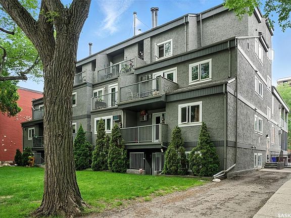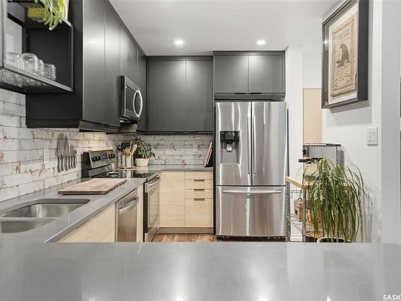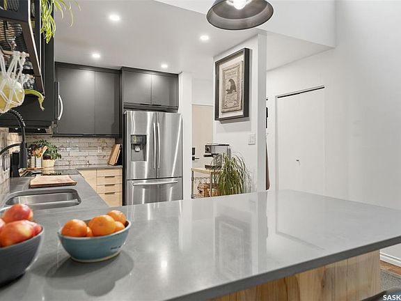 Welcome to the Chateau on 4th. This unique top-floor apartment-style condo is nestled in the heart of Saskatoon's City Park neighborhood. This isn't your average condo - The high vaulted ceilings in this unit create an airy, spacious atmosphere that is rarely found, complementing the open-concept design perfectly. You'll love the recent, high-quality renovations, including a sleek, modern kitchen and a stunning renovated bathroom. The entire space features new flooring throughout, offering a fresh, contemporary look. A custom-designed built-in dining nook, complete with beautiful custom woodwork benches, provides a stylish and functional centerpiece for meals and entertaining. The unit offers 2 well-sized bedrooms, one with a built in murphy bed. in-suite laundry included here for an extra added bonus. Large private balcony to enjoy your morning coffee or evening drink. You'll also appreciate the peace of mind that comes with your own covered parking stall. Experience the perfect blend of modern upgrades, unique architectural features, and an unbeatable location. This gem is ready for you to move in and enjoy!