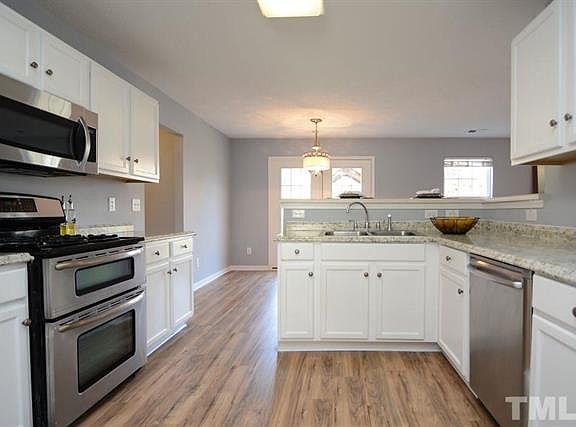 MUST SEE! This 4 bedroom, 2.5 bath home is move in ready. Features include; an open floor plan w/nature light, a chef's kitchen with new floors, white cabinets, stainless steel appliances, all new carpet and paint, new lighting inside and out, HUGE bedrooms, 4th bedroom could be a bonus/media room, wood burning fireplace, master suite with walk in closet and so much more. Private back yard offers two back patios, a fully fenced yard and a play set. Great location, close to 55 and 540. Pool community!