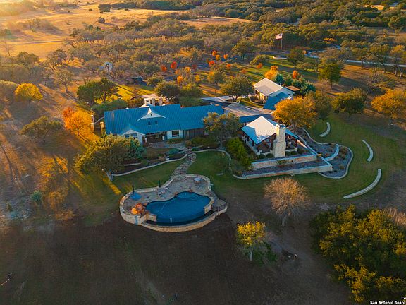 Welcome to this manicured 51-acre ranch surrounded by hill country views in a 900-acre gated pastoral community. Enter the property via private gate, drive the paved, winding tree-lined road past the flag to the main home, guest cabin, entertainment pavilion. The primary home is a 3-bed, 2-bath (3389 sqft) home and 1-bed, 1-bath guest cabin that features vaulted wood and beam ceilings, massive fireplace, wood stove, alder and rock walls, walk in showers, granite countertops, outside screened dining and covered sitting areas with panoramic views. There is parking for 10, windmill, cedar encased cistern, flagstone walkways, custom iron gates, large private courtyard, extensive irrigation and 2 excellent wells, rock bordered raised flower beds, 3 septic systems, 60kw diesel generator with 750-gallon fuel capacity, livestock buildings with paddocks, large barn, fencing, shooting range, seasonal creek, pond, hot tub, swimming pool, and a covered concrete slab RV pavilion with 50-amp service. This property is a haven for year-round outdoor entertainment as well as ultimate comfortable and cozy inside living. Wildlife is abundant, hunting is allowed, with a wildlife tax exemption for each residence. Property Address: 431 Bluff Creek Rd., Center Point, TX 78010.