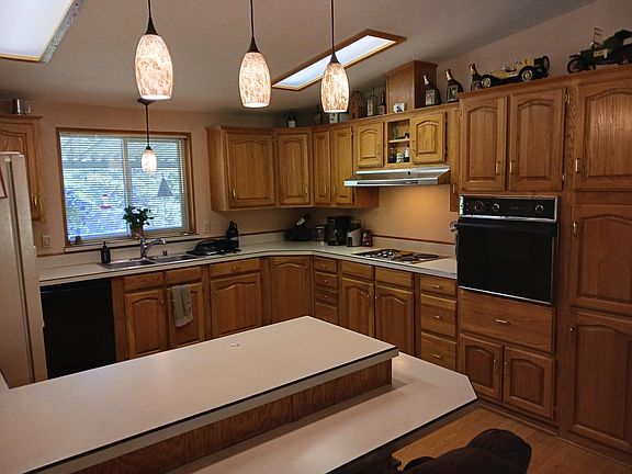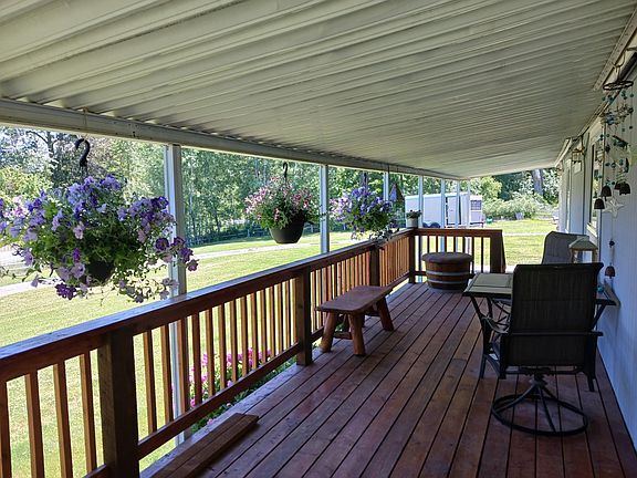 Immaculate 2 bedroom, 2 bath manufactured home only minutes to town on this well manicured fenced lot. Large attached addition for hobbies, crafts, etc with sink and range already there. Huge kitchen with wrap around bar and numerous cabinets for storage with built in appliances and excellent lighting. Pellet stove in living room and central air conditioning. Large covered deck and patio in front for entertaining and relaxation. Large 2300 sq. ft. 3 car garage with 14 ft door for motor home's etc. Insulated workshop with wood stove, and bathroom. Community Water system. Carport and shed.