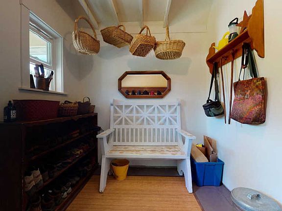 This quality-built cape is situated in a peaceful paradise setting on 5.5 acres of a mix of open and wooded land. The thoughtfully designed home features wide pine floors, beautiful woodwork, trim, and built-ins. A professionally designed kitchen maximizes the efficiency of work space and includes an under-mounted sink, stainless steel appliances, high-end cabinets with corian and butcher block countertops. First floor offers two bedrooms with downstairs full bath (one currently used as a living/sitting room). The second floor offers another bedroom and bath, and a wide open seating/family area, perfect for reading and relaxing. Beyond that, this home has details to make your life easier and keep your costs down, including LED lighting, energy-efficient blinds, and radiant heating on all floors. High ceilings in the basement with radiant floor heat is just waiting to be built into. A workshop and ventilated root cellar are also a part of this spacious basement. Outside enjoy the raised beds, mature perennials and fruit bearing bushes and trees.