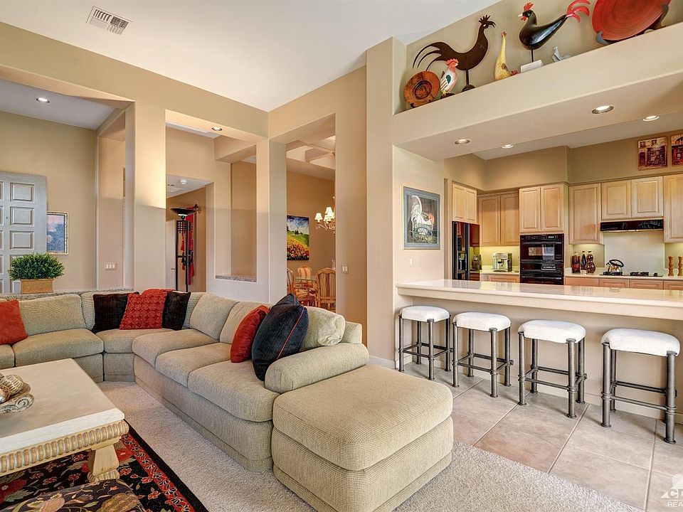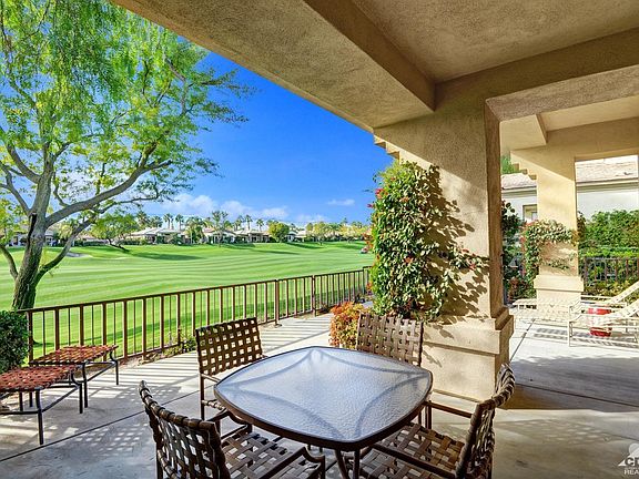This light, bright, super sharp home shows like a model! South facing for warm sunshine all year long and views of the 3rd fairway of the Arnold Palmer Grove course. Tastefully turnkey furnished, soft desert paint tones throughout, large floor tiles, bull nosed corners, and extra large patio all add to the ambiance & value of the home. The kitchen and bar open to the family room creating the ever popular great room with shutters, floor to ceiling mirrors & thick granite- topped pony walls. A complete upgraded A/C & heater unit was installed in September 2014 for energy efficiency. One of the 37 community pools/spas is located just steps away and the famous Rover's Ridge dog park is at the end of the block. Don't hesitate as this home will not last long!