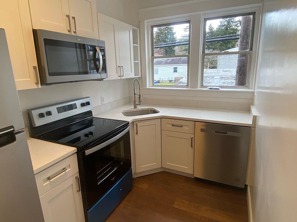 LARGE, First floor, fully renovated and freshly painted, 1800+ Sq Ft 4 bed, 1.5 bath apartment. Enjoy brand new EVERYTHING in this fully remodeled apartment. The new kitchen is beautifully done with new cabinets, quartz countertops, undermount sink, and new stainless steel appliances, including a new dishwasher, refrigerator, hanging microwave, and electric oven. The new bathrooms (one full and one half) features brand new light fixtures, vanity and toilet. There is new luxury vinyl plank flooring installed throughout the kitchen, bathroom, and living room while brand new carpet is installed within the bedrooms. This apartment features a stacked washer/dryer included in rent and electric baseboard heaters are controlled via wall thermostats for tenants' convenience. Parking is available for an additional fee. Pets considered on a case by case basis for an additional fee. Available July 15 Tenants are responsible for Electric, which is appliances, baseboard heat, and hot water. Appliances included: Electric Oven/Range + Refrigerator + Dishwasher + Microwave + Washer/Dryer Pets are considered on a case by case basis with an additional fee. Off Street Parking available for additional fee. Utilities included are Cold Water, Sewer, Trash, Lawn/Shrubbery Care & Snow/Ice Removal (Landlord pays). Tenants are responsible for Electric (which includes heat). Total Monthly Household income should be 3.0 times rent (gross), supporting documentation will be required. 1st month rent required up front, and security deposit required.