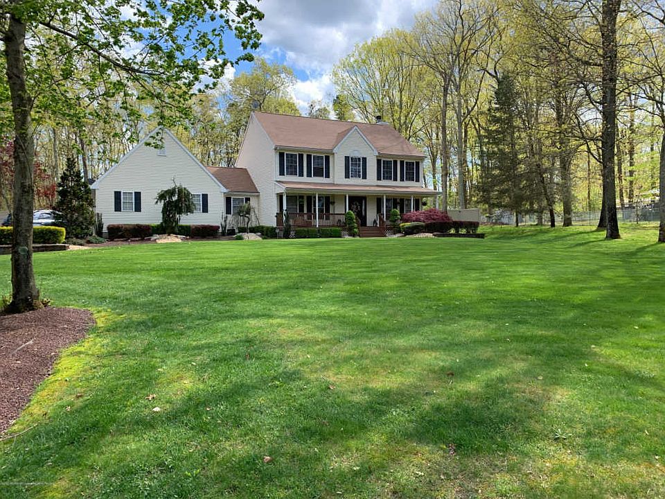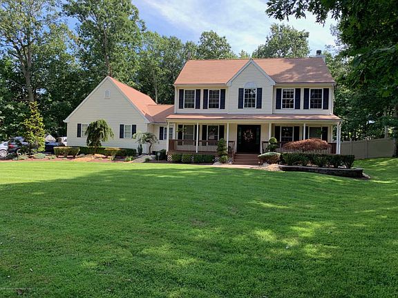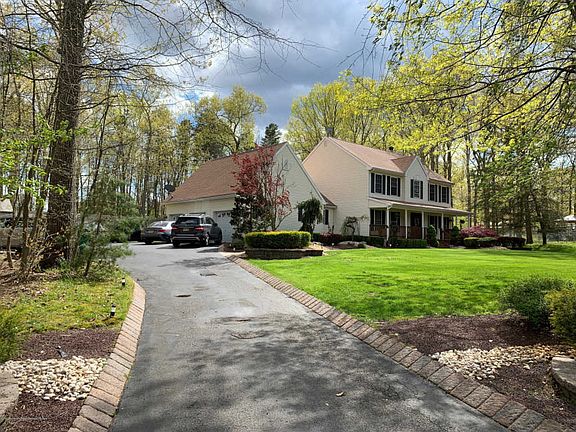 Nestled in the woods is this beautiful and upgraded 4 bd colonial. Up the paver walkway from the rocking chair front porch, enter to find a 2 story foyer and an open and spacious living area. Kitchen features ss appliances, granite, tile backsplash, and sunny breakfast area. Family room adorned with gleaming hard wood floors and stone fireplace. Large DR with crown molding just off kitchen. 3 spacious bedrooms upstairs. Master bath features large jetted tub with custom tile. High ceilings in the huge basement. Attached 3-car garage is a car enthusiast's dream with lifts, workspace, and a massive amount of storage above up the staircase. In the backyard find a fenced-in private oasis with in-ground pool, custom pavers, plenty of room to play. Way too many features to list. Come and see!