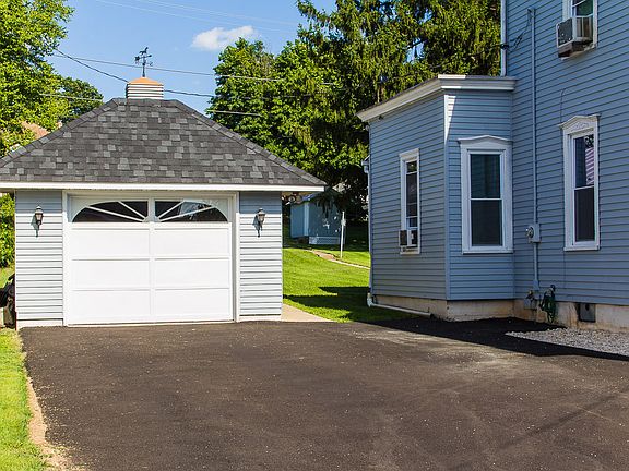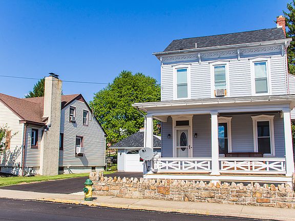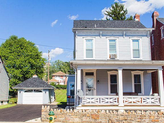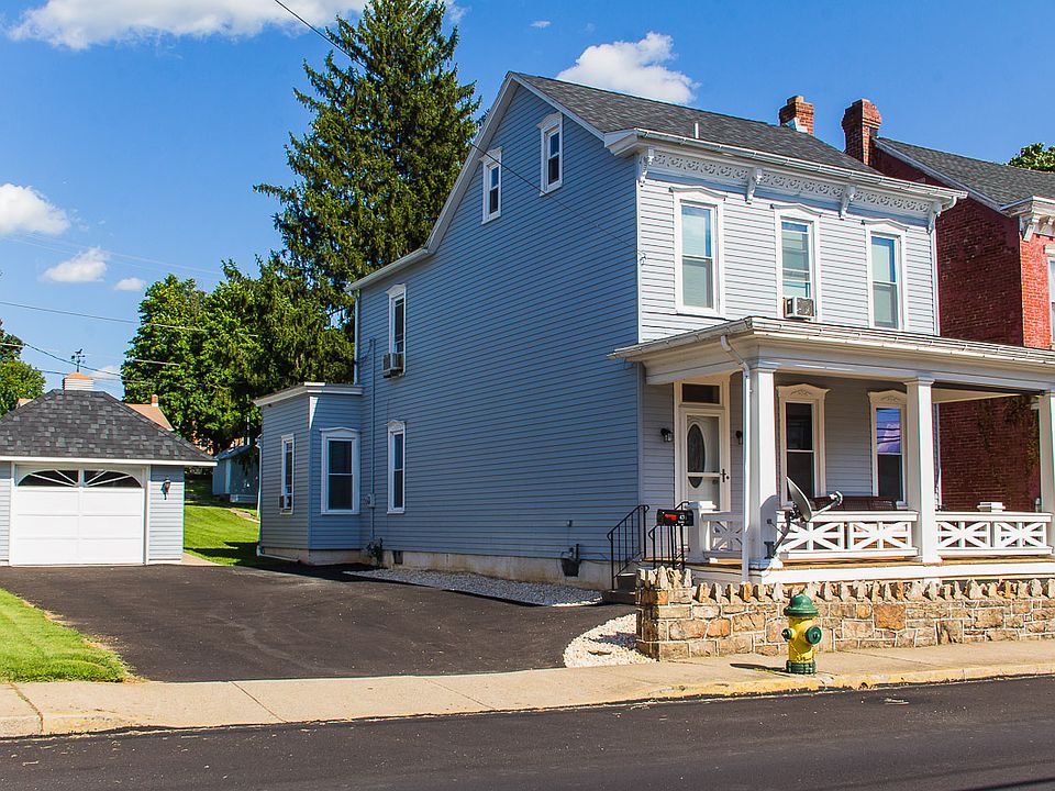 Here in the heart of Shoemakersville, this beautiful home boasts of large rooms, 9-foot ceilings, hardwood floors, crown molding, a formal dining space, and a wonderfully large in-town yard. Many improvements were made to the property over the last few years, including a new 50-year architectural shingle roof, new windows, new furnace and tank, new extra-wide driveway (which fits 5 cars), fully redone exterior, and more. Enjoy your evenings relaxing on the large front porch, or tinker on a project in the detached one-car garage (with electric). With dual closets and a storage window-bench in the master bedroom, a large attic, and a "secret closet" hand-built by the current owner in the living room, you'll find plenty of storage space. When winter comes around, stay warm and save money with the toasty wood stove.