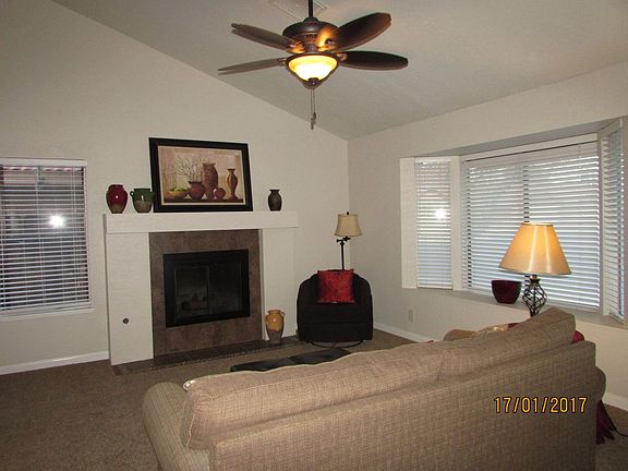 This Heritage Village Home is beautifully remodeled! Entrance has tiled design. Kitchen has quartz counter tops, diamond designed kitchen floor,newer cabinets, stainless appliances including refrigerator, recessed lighting. Fireplace has been modernized with contemporary design. Both bathrooms remodeled with tile showers, floors modern cabinets. Inside laundry room. The backyard has a covered patio with plenty of room for entertaining or just enjoying the great desert days and nights. Two car garage. This property has a nice side yard for extra space.