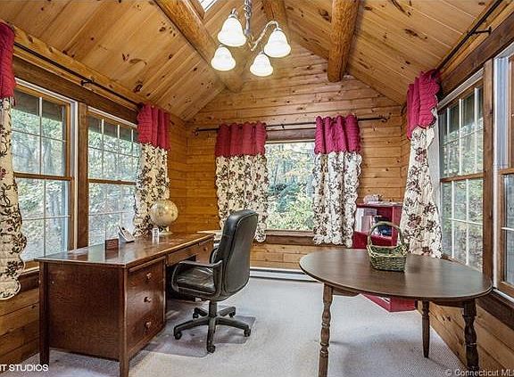 This cozy log house is right at home nestled in a wooded neighborhood on a quiet road. It boasts 2-3 bedrooms, 2 full baths, and an eat-in kitchen. The living-dining area features a gas log stove and wide board floors. Access the wrap around rear deck through the sliders off the living room and master bedroom. Enjoy your morning coffee listening to the sounds of nature while seated on your front porch swing. You will find numerous closets and plenty of storage space throughout this special home. The wood stove in the partially finished basement supplements winter heating. The loft in the oversized 2 stall garage is ideal for any number of uses: a workshop, an artist's loft, an office. Bring your ideas and make it your own!